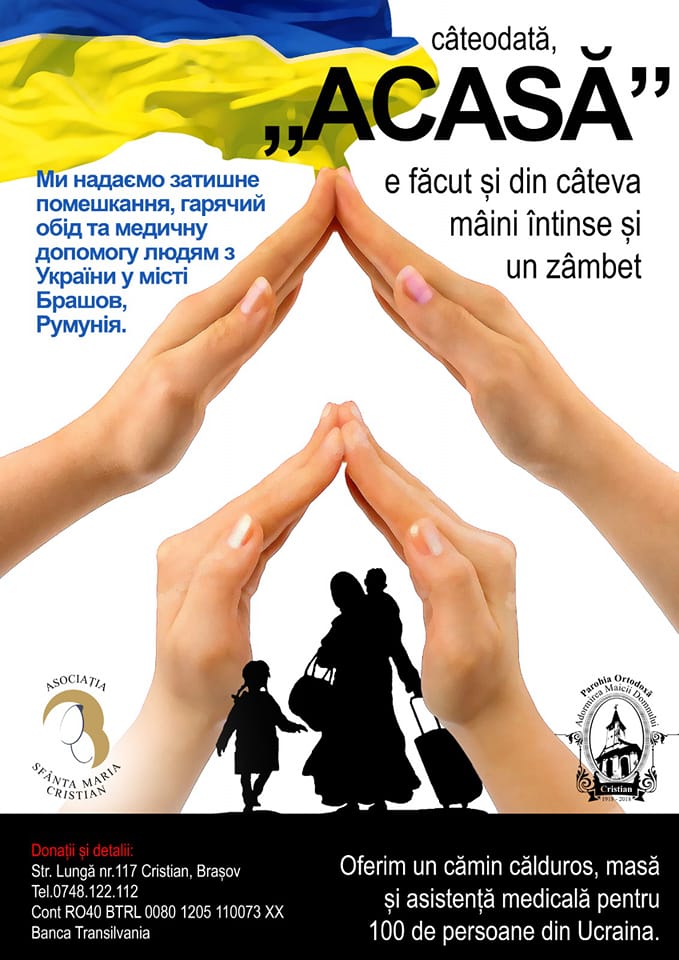 „Dragii nostri, in momentul de fata, #AsociatiaSfantaMaria din Cristian, Brasov poate sustine pe termen lung, oferirea unui camin calduros si decent pentru aproximativ o suta de persoane. Suntem sprijiniti de credinciosii Bisericii „Adormirea Maicii Domnului”, de o echipa de voluntari vorbitori de limbile ucraineana, rusa, germana si engleza dar in toate demersurile noastre cautam sustinerea de Sus. Dumnezeu sa ne ne apere pe toti!” – Roxana Dobre.