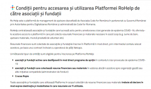 Platforma RoHelp.ro este construită cu sprijinul și ajutorul Romanian American Foundation, ING Bank și al Fundației Vodafone România în parteneriat cu Guvernul României prin Autoritatea pentru Digitalizarea României, Departamentul pentru Situații de Urgență și Federatia Fundațiilor Comunitare din România și este deschisă tuturor asociațiilor și fundațiilor legal constituite în România care derulează activități pentru ameliorarea crizei generate de epidemia COVID-19 si nu nu realizează activități și nu realizează activități și nu susține cauze de natură politică sau care discriminează pe considerente legate de etnie, rasă, sex, orientare sexuală, religie, capacități fizice sau psihice sau de apartenența la una sau mai multe categorii sociale sau economice, iar membrii conducerii organizației nu sunt implicați politic.