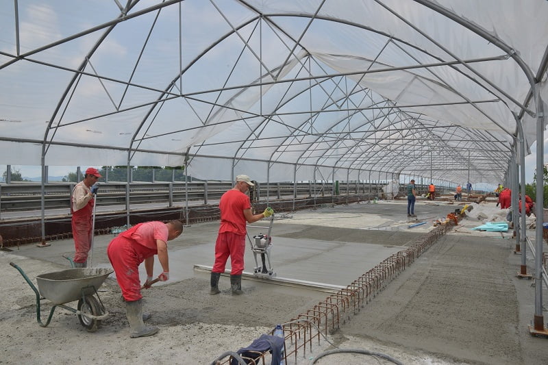 *Placa de suprabetonare se toarnă pe segmente. Astfel, la sfârșitul lunii mai s-au turnat primele segmente din placa de suprabetonare, iar acum se toarnă plăcile dintre cele turnate anterior.