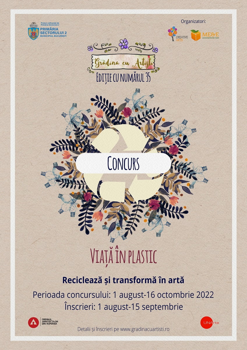 Pe 1 august s-a dat startul concursului Viata in plastic – recicleaza si transforma in arta, organizat de echipa mini-festivalului urban Gradina cu Artisti, ce isi propune sa promoveze reutilizarea creativa a materialelor reciclabile din plastic si transformarea lor in lucrari de arta cu utilitate pentru spatiul public. Artistii din toata tara se pot alatura celei de-a 35-a editii a evenimentului, pana pe 15 septembrie, iar lucrarile selectate in urma jurizarii vor face parte dintr-o expozitie temporara care va putea fi vazuta intre 7 si 16 octombrie, in parcurile Ioanid si Gradina Icoanei din Sectorul 2 Bucuresti.