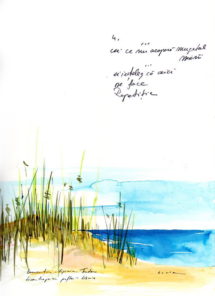 În fine, așa a ieșit ce a ieșit și ne bucurăm să arătăm rodul întâlnirii poetului cu pictorul tocmai de Ziua Internațională a poeziei (e, până la urmă, o expoziție de poezie)! Vorbeam cu Horia și amândoi am avut în cap, în ce privește tablourile, amintirea aceea din copilărie când colecționam timbre și alergam după colițe. Mai țineți minte? Așa sunt și aceste tablouri, niște colițe: poemul scris de mână, caligrafic, chiar de autor, însoțit de ilustrarea artistului plastic.
