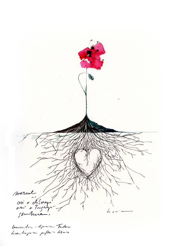 Laurențiu-Ciprian Tudor: Povestea e simplă. E cam așa: artistul plastic și prietenul Horia Țigănuș (am făcut lucruri faine anul trecut cu el și cu Nicu Alifantis) s-a plimbat prin cartea mea și m-am ales cu 16 preafrumoase „citiri” (plecând de la câteva versuri sau bucăți de poem). Împreună, am pus alături „citirile” lui cu poemele care l-au inspirat (scrise de mine de mână) și au ieșit 16 tablouri care (zic eu) te cheamă! Am luat aceste tablouri, le-am pus rame și paspartú și le-am oferit celor de la „Rază de speranță” pentru cei de care se ocupă (cu multă dedicare): COPIII CU AUTISM. Așa s-a făcut o frumoasă expoziție cu vânzare!