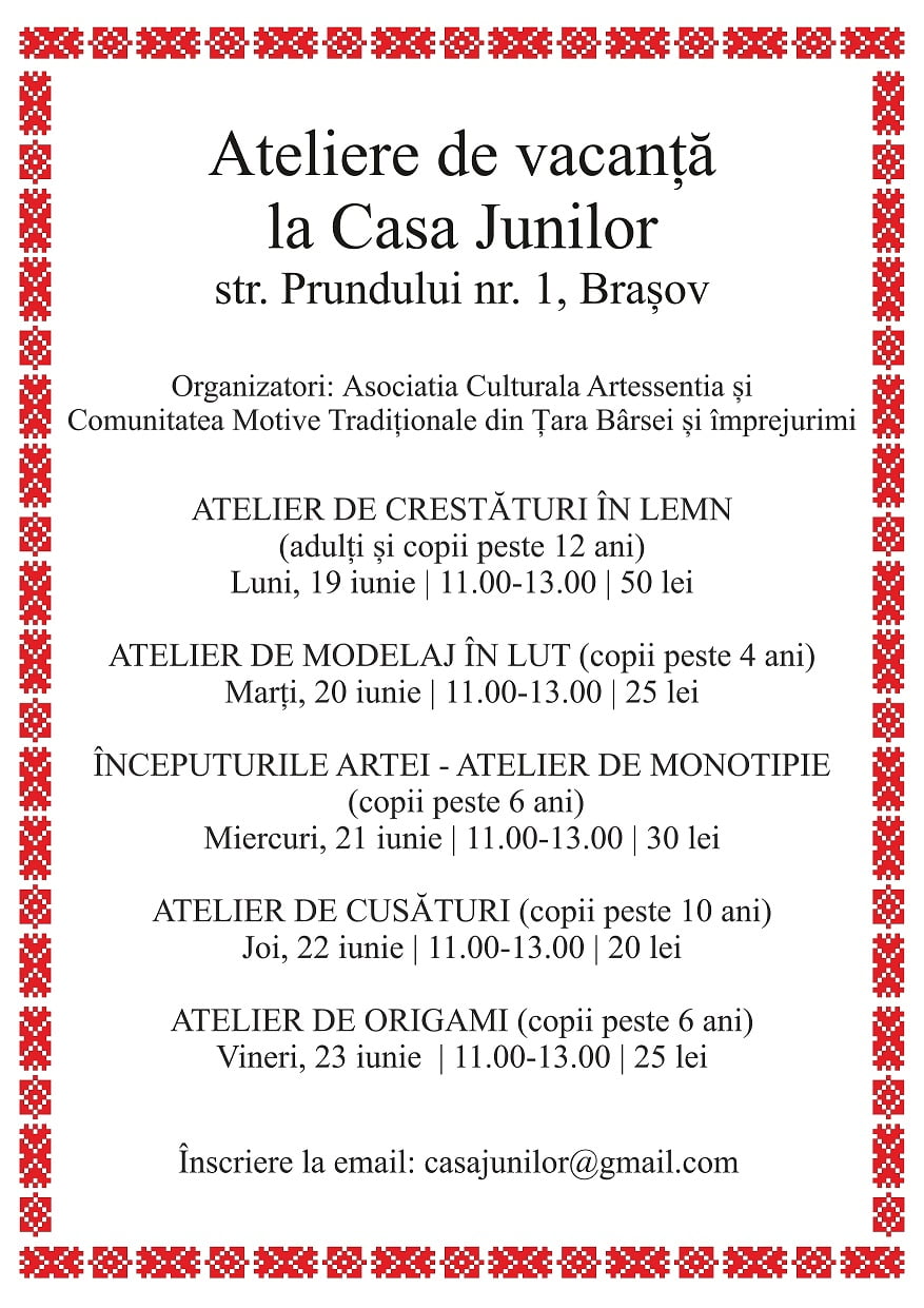 Uniunea Junilor din Şcheii Braşovului şi Braşovechi, împreună cu partenerii săi, îi invită pe copii, părinţi şi bunici, la atelierele de arte şi meşteşuguri specifice zonei şi nu numai, organizate la Casa Junilor pe perioada vacanţei de vară.