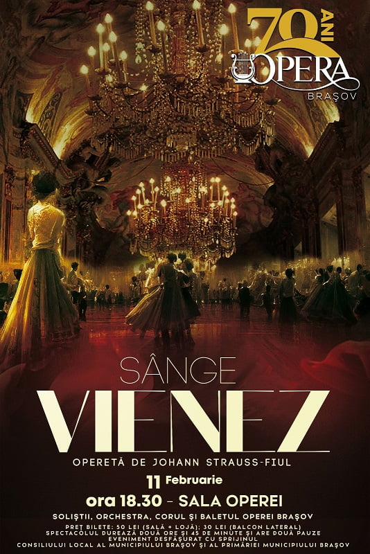 Sâmbătă, 11 februarie 2023, de la ora 18.30, în Sala Operei Brașov, vă așteptăm la spectacolul cu spumoasa operetă „Sânge vienez” de Johann Strauss-fiul. Acest eveniment a avut un parcurs inedit la Opera Brașov, din cauza pandemiei, premiera având loc online, în transmisiune directă, pe canalele de socializare ale instituției, pe 27 martie 2021. Pentru al doilea an, consecutiv, putem prezenta spectacolul integral, în Sala Operei, fără restricții… Poate, și din acest motiv, biletele pentru „Sânge vienez” s-au epuizat în doar 40 de minute în ziua în care s-au pus în vânzare!