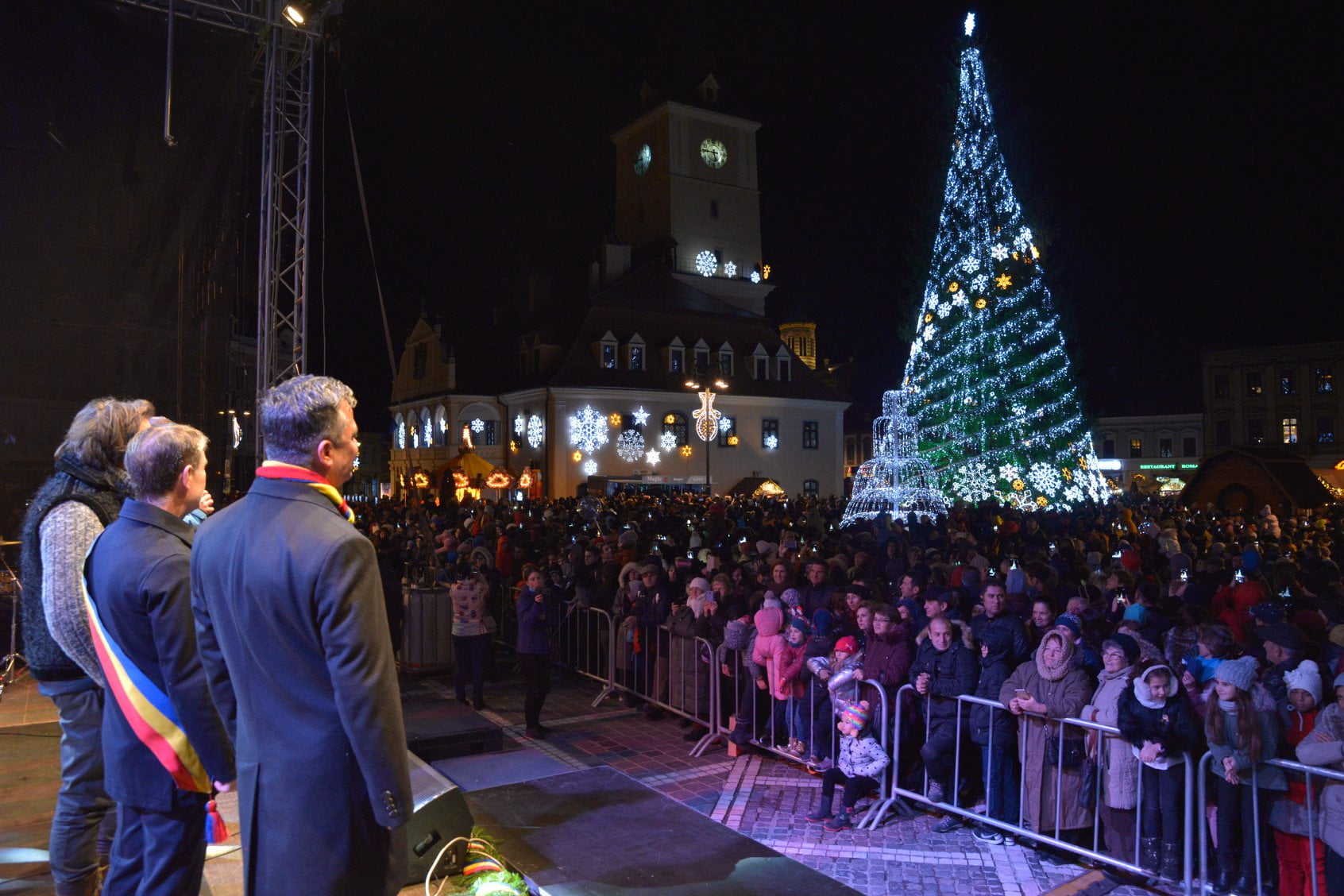 După ce a participat la parada militară dedicată zilei de 1 Decembrie și la evenimentele din Piața Unirii, primarul George Scripcaru, împreună cu președintele Consiliului Județean Brașov, Adrian Veștea, și cu realizatorul documentarului despre România care a ajuns celebru în toată lumea, Charlie Ottley, a aprins luminițele din bradul de Crăciun.