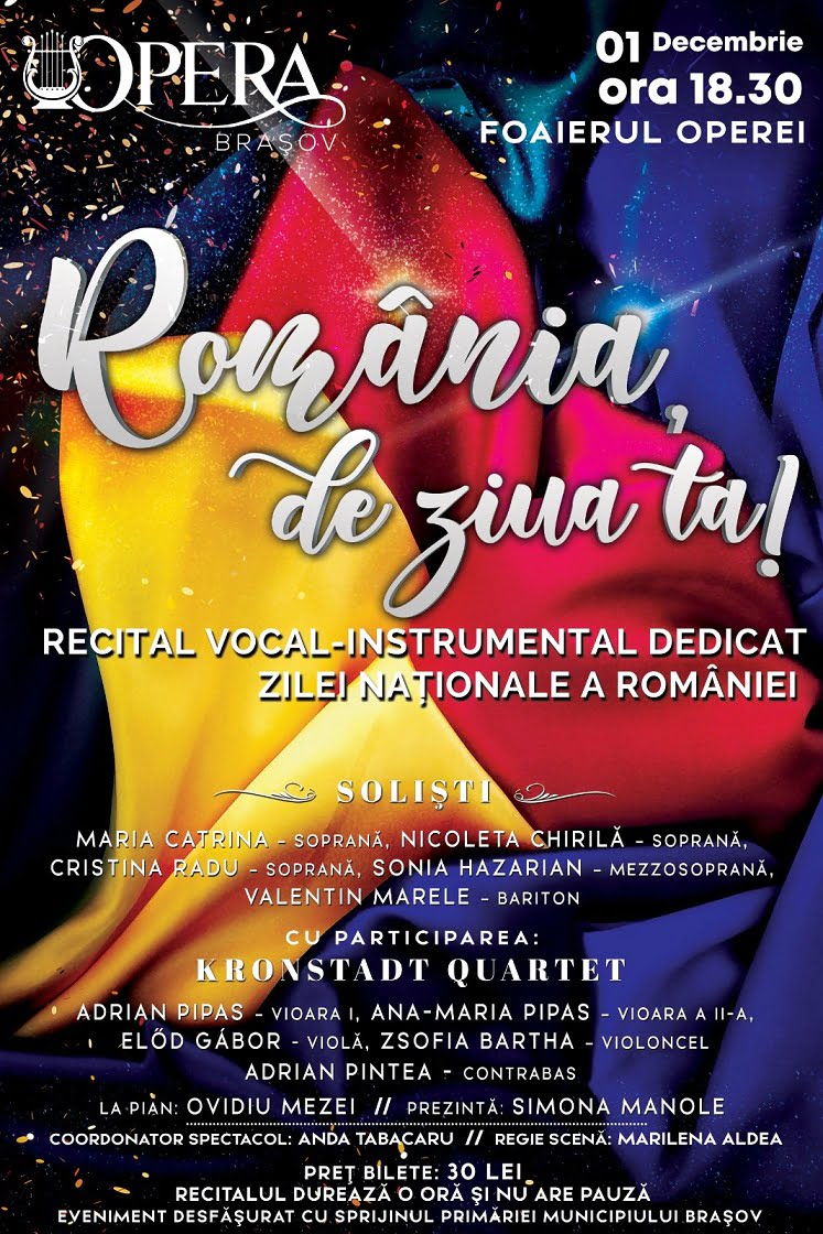 De asemenea, veți putea asculta îndrăgita „Baladă” a lui Ciprian Porumbescu și un fragment din „Suita ardeleană” de Nicușor Silaghi. Recitalul va fi susținut de artiștii Operei Brașov: Maria Catrina – soprană, Nicoleta Chirilă – soprană, Cristina Radu – soprană, Sonia Hazarian – mezzosoprană, Valentin Marele – bariton, alături de Kronstadt Quartet (Adrian Pipas – vioara I, Ana-Maria Pipas – vioara a II-a, Előd Gábor – violă, Zsofia Bartha – violoncel) și Adrian Pintea – contrabas. La pian îi va acompania Ovidiu Mezei. Prezintă: Simona Manole. Coordonator spectacol: Anda Tabacaru. Regie scenă: Marilena Aldea