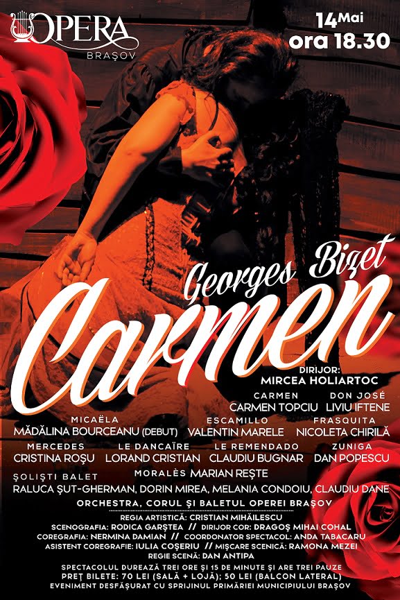 Sâmbătă, 14 mai 2022, de la ora 18.30, în Sala Operei Brașov, vă invităm să vizionați una dintre cele mai îndrăgite și apreciate opere din istoria muzicii: „Carmen” de G. Bizet.