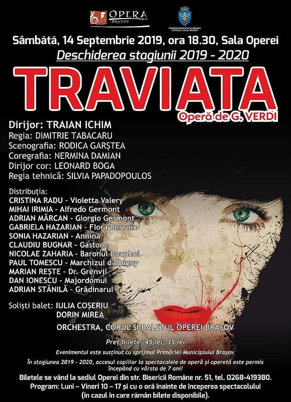 Sâmbătă, 14 septembrie 2019, de la ora 18.30, în Sala Operei, deschiderea oficială a noii stagiuni, cea de-a 67-a a Operei Brașov, 2019 – 2020, va avea loc cu opera „La Traviata” de G. Verdi, un obicei devenit tradiție pentru Opera Brașov.
