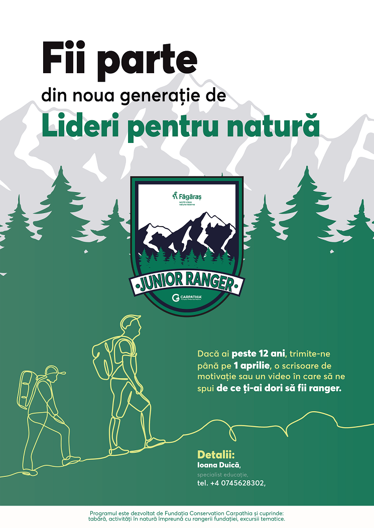 Fundația Conservation Carpathia își propune să crească noua generație de lideri pentru natură și lansează programul „Junior Ranger”. Proiectul se adresează copiilor peste 12 ani, din Sudul Munților Făgăraș, și implică copiii într-o serie de activități despre natură, în natură, alături de rangerii fundației, deschizându-le astfel orizontul către o nouă profesie de viitor.