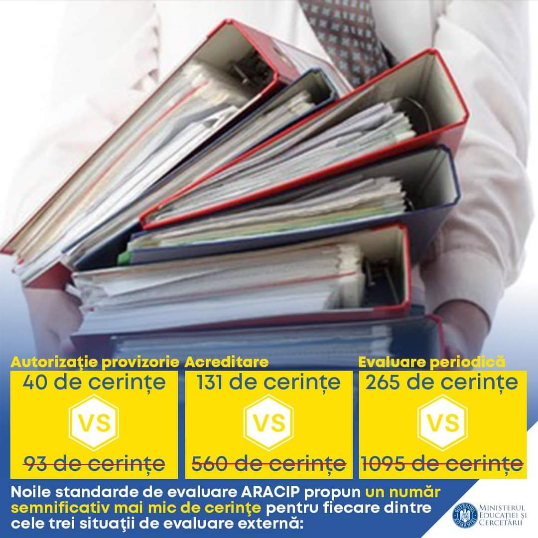 „Modificările operate au urmărit câteva principii. Mai întâi, simplificarea, adică reducerea cerințelor pentru autorizare sau acreditare. În acest caz, reducerea este substanțială: 77% pentru acreditare, 76% pentru evaluare periodică și 57% pentru autorizarea de funcționare provizorie. Mai exact, de la 1.095 de cerințe existente am ajuns la 265. Celălalt principiu urmărit a fost debirocratizarea, măsură asumată încă de la preluarea mandatului meu. Prin urmare, 95% dintre documentele care vor fi solicitate pentru acreditare sau autorizare sunt documente manageriale, documente care nu vor mai viza activitatea cadrelor didactice”, a declarat ministrul Monica Cristina Anisie.