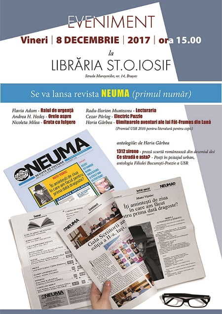 Vineri, 08.12, începând cu ora 15.00, la Librăria Șt.O. Iosif din Brașov, va avea loc la un eveniment al Editurii Neuma, care va consta în lansarea primului număr al revistei omonime, precum și în scurta prezentare a volumelor de autor: Flavia Adam – „Raiul de urgență”, Andrea H. Hedeș – „Orele aspre”, Nicoleta Milea – „Grota cu fulgere”, Radu-Ilarion Munteanu – „Lecturaria”, Cezar Pârlog – „Electric Puzzle”, Horia Gârbea – „Uimitoarele aventuri ale lui Făt-Frumos din Lună” (Premiul Uniunii Scriitorilor din România (USR) / 2016 pentru literatură pentru copii) și antologii: „1312 – Proză scurtă românească din deceniul doi” și „Ce stradă e asta?” – Poeți în peisajul urban, antologia Filialei București – Poezie a USR.