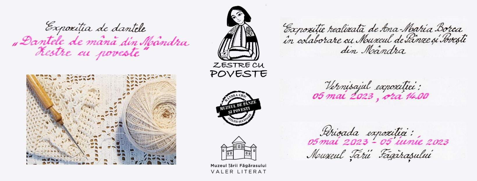 Expoziția „Dantele de mână din Mândra – Zestre cu poveste” este prima din seria de expoziții și evenimente colaborative și itinerante, propuse de Muzeul de Pânze şi Poveşti din Mândra în campania de recuperare a unor meșteșuguri de patrimoniu, aproape pierdute, din Țara Făgărașului.