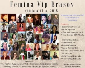 AFAFCI (Asociația Femeilor de Afaceri și a Femeilor Conducătoare de Întreprinderi din Brașov) vă invită la Gala Femina VIP Brașov, ed. a VI-a, care se va desfășura duminică, 16 septembrie 2018, ora 18.00, la Aula Universității Brașov. Astfel, proiectul lansat în 25 aprilie 2018 se încheie odată cu decernarea Trofeului „Femina VIP 2018”, însă apreciate vor fi toate cele 39 de aspirante la acest titlu acordat de AFAFCI Brașov.