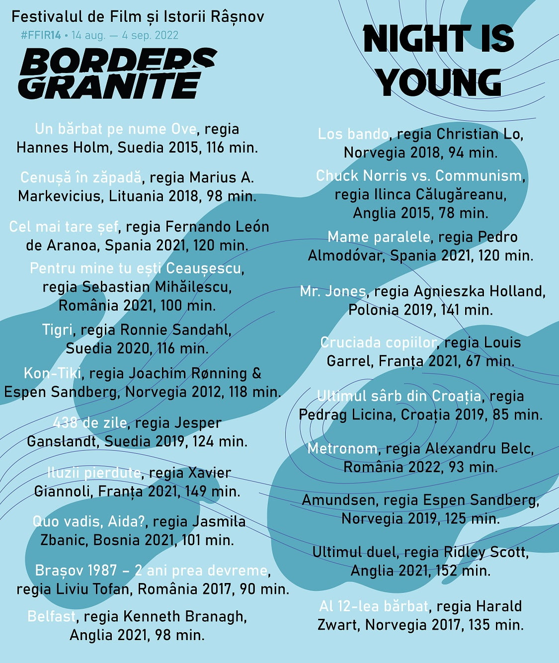 Ediția a XIV-a a Festivalului de Film și Istorii Râșnov (14 august – 04 septembrie 2022) aduce în fața publicului 21 de filme importante din cinematografia românească și internațională. Selecția de filme de la FFIR2022 de anul acesta se concentrează în jurul ideii de #Granite / #Borders.