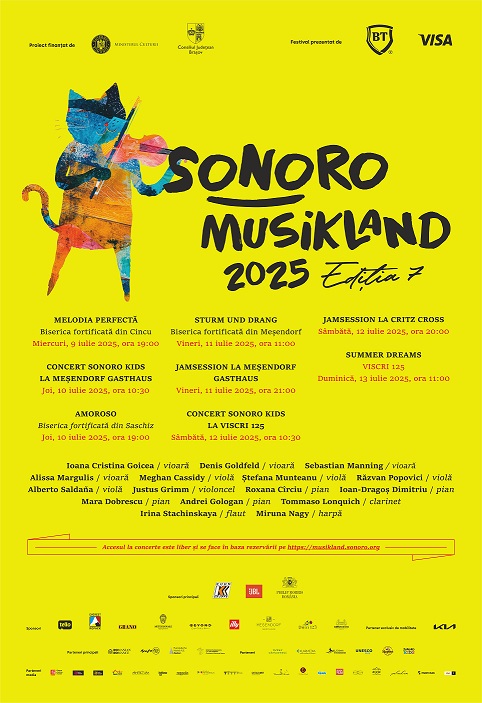 SoNoRo Musikland, festivalul dedicat tradițiilor și patrimoniului orașului Brașov și al câtorva sate de pe Colinele Transilvaniei, se va desfășura în perioada 4-19 iulie 2025 și va include în acest an și orașul Sibiu. 15 concerte – dintre care două jamsessions și trei concerte SoNoRo Kids, în perioada 9-19 iulie a.c. – vor pune în valoare capitalul cultural din județul Brașov, prin intermediul muzicii de cameră, la apus de soare și lumina lunii. Accesul la toate concertele ediției a VII-a este liber, în baza unei rezervări pe site-ul festivalului.