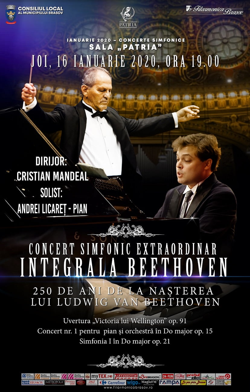 Orchestra Simfonică a Filarmonicii din Brașov dirijată de Cristian Mandeal, concert ce va debuta cu o lucrare beethoveniană mai puţin cunoscută: Bătălia lui Wellington, în primă audiţie la Braşov. Aceasta va fi urmată de celebrul Concert pentru pian şi orchestră nr. 1, solist Andrei Licareţ şi Simfonia I de Ludwig van Beethoven.