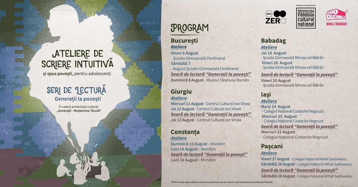 Generații – Moștenirea tăcută cuprinde un spectacol de teatru pe tema moștenirii transgeneraționale, ateliere de scriere intuitivă pentru adolescenți, storytelling și seri de lectură.