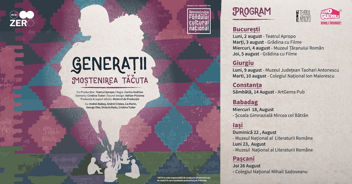 Spectacolul de teatru Generații – Moștenirea tăcută, al cărui scenariu este inspirat din mai multe povești reale culese de la părinții, bunicii și străbunicii aceleași familii, va avea premiera în 2 august la Apropo București, și alte 3 reprezentații la Grădina cu Filme (3 și 5 august) și la Muzeul Național al Țăranului Român (4 august).