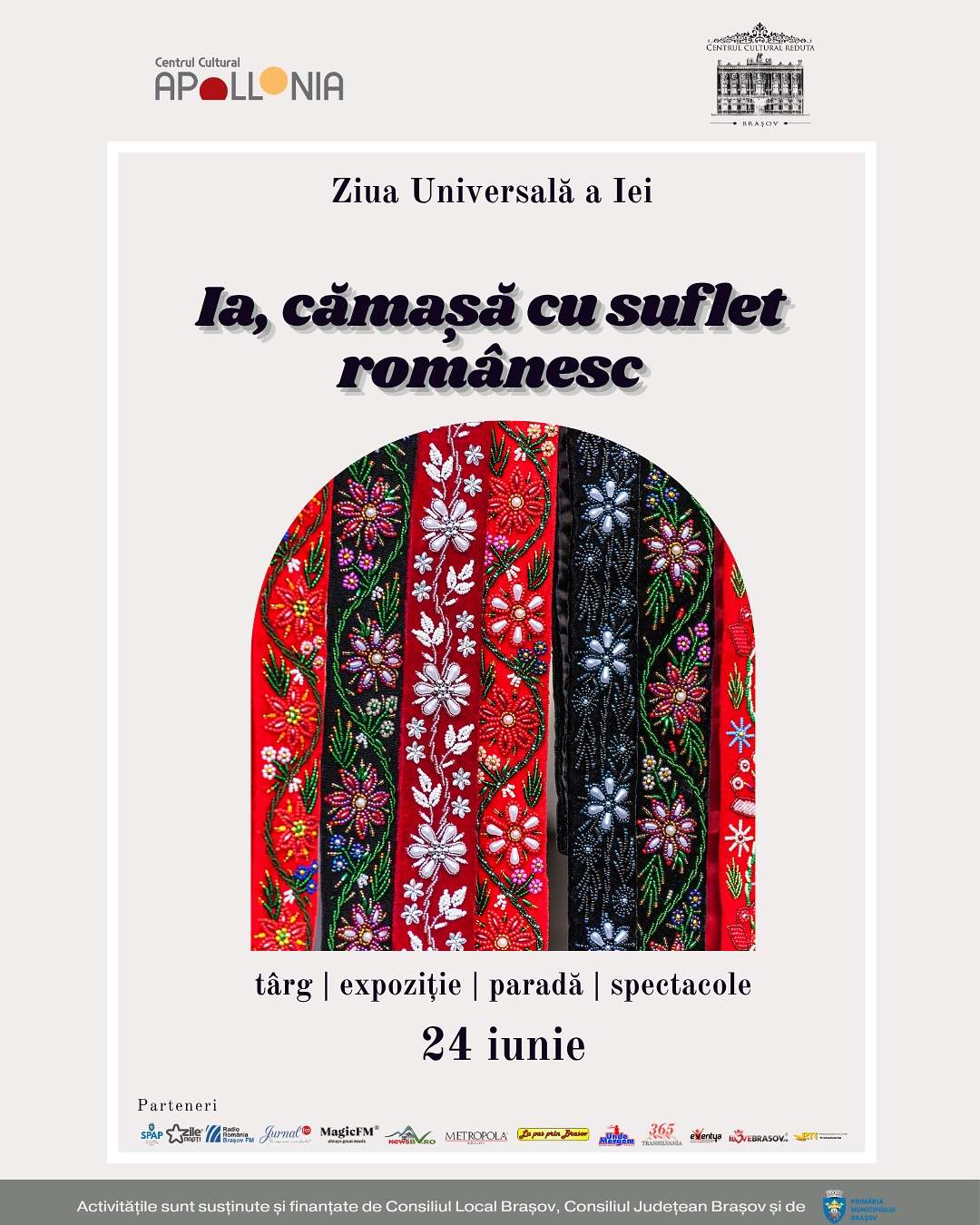 Centrul Cultural Reduta și Centrul Cultural Apollonia organizează, în data de 24 iunie 2025, de Ziua Universală a Iei, evenimentul cultural-artistic ”Ia, cămașă cu suflet românesc”, în care va fi sărbătorit portul tradițional românesc și tradițiile aferente sărbătorilor Drăgaica și Sânzienele.