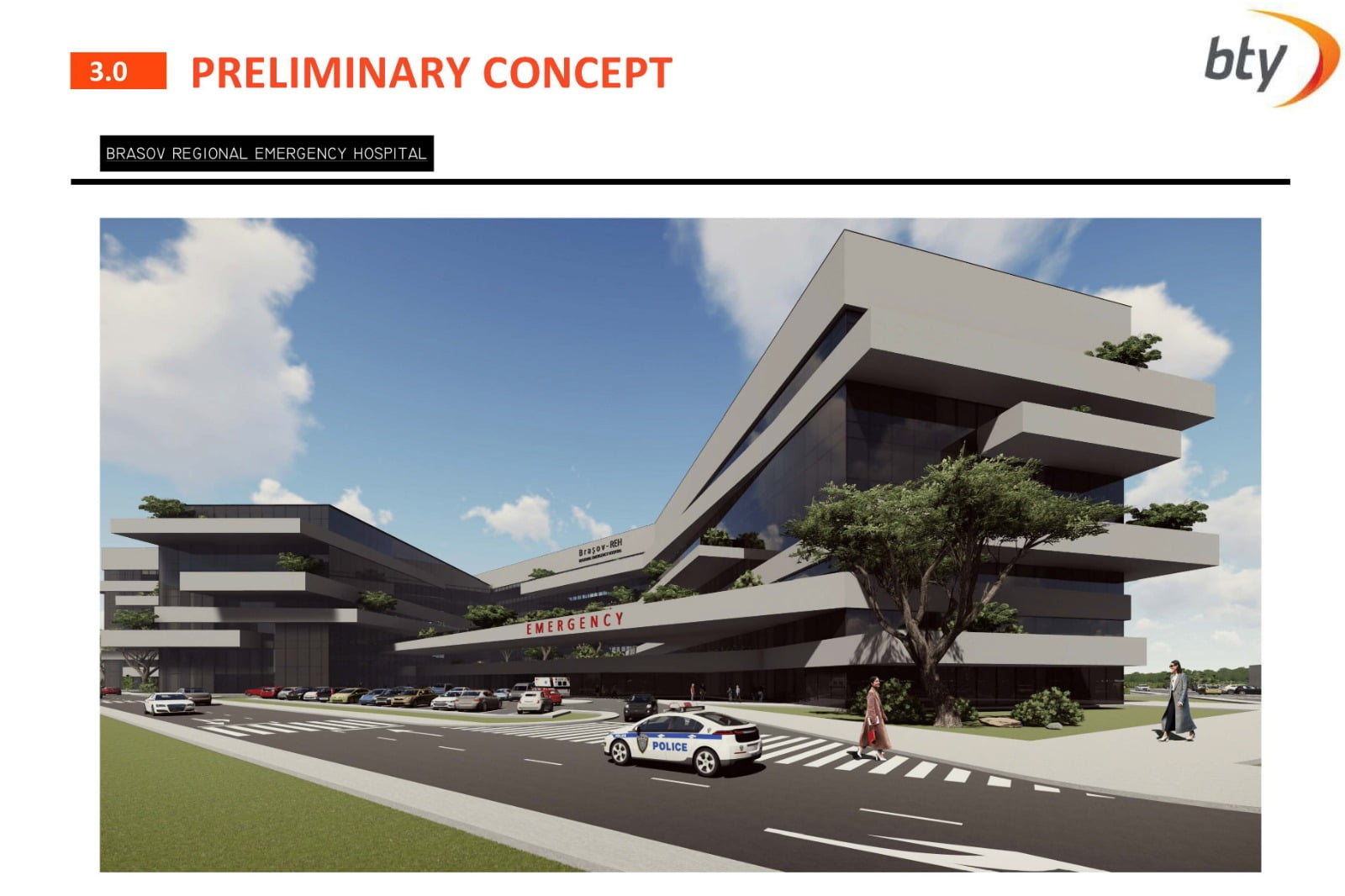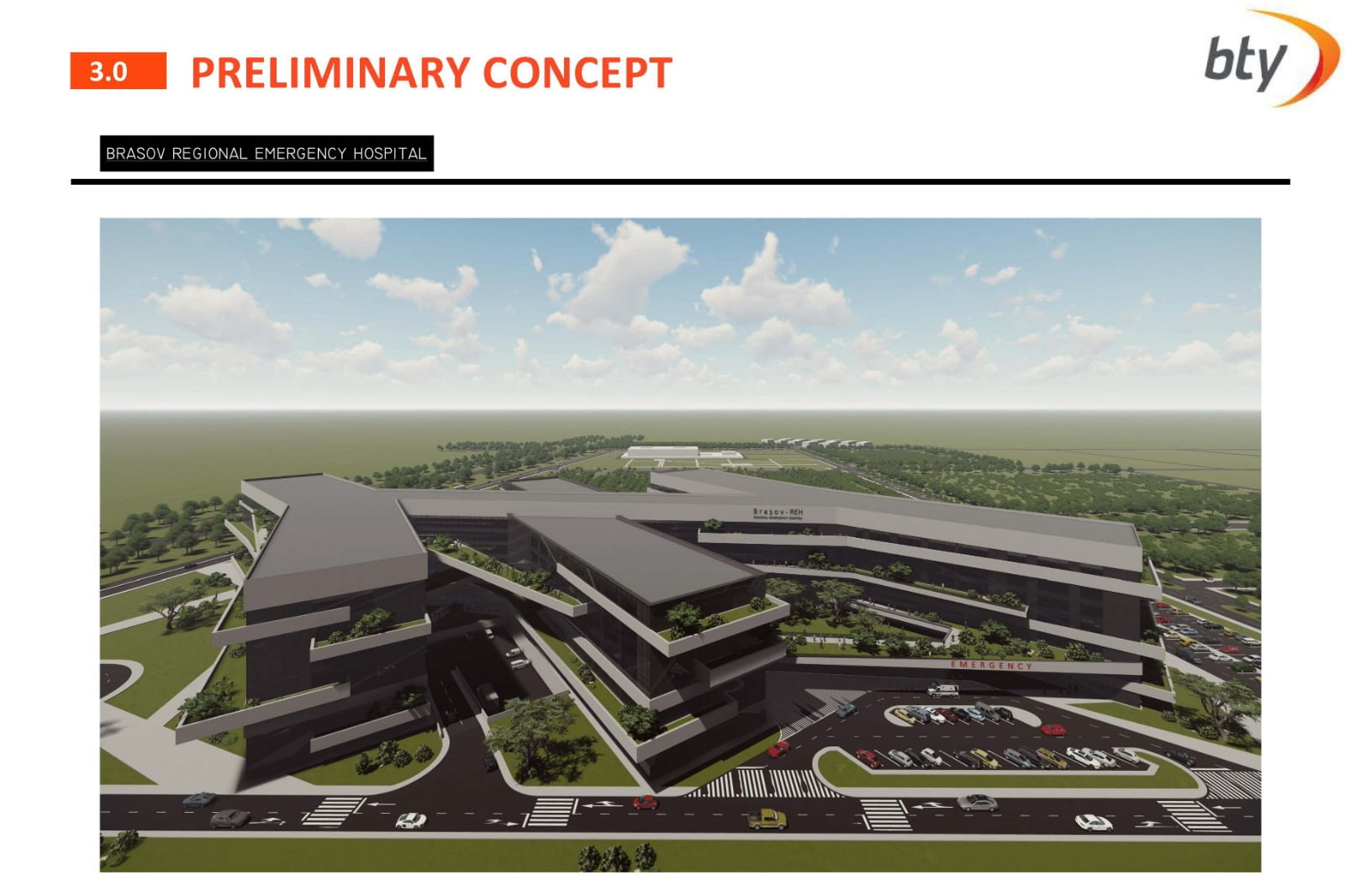 Consorțiul selectat de BERD pentru proiectul Spitalului Regional de Urgență Brașov a trimis primăriei, spre analiza Grupului de lucru stabilit la nivelul municipiului Brașov, conceptul preliminar al viitorului spital și primele imagini ale viitorului complex medical.