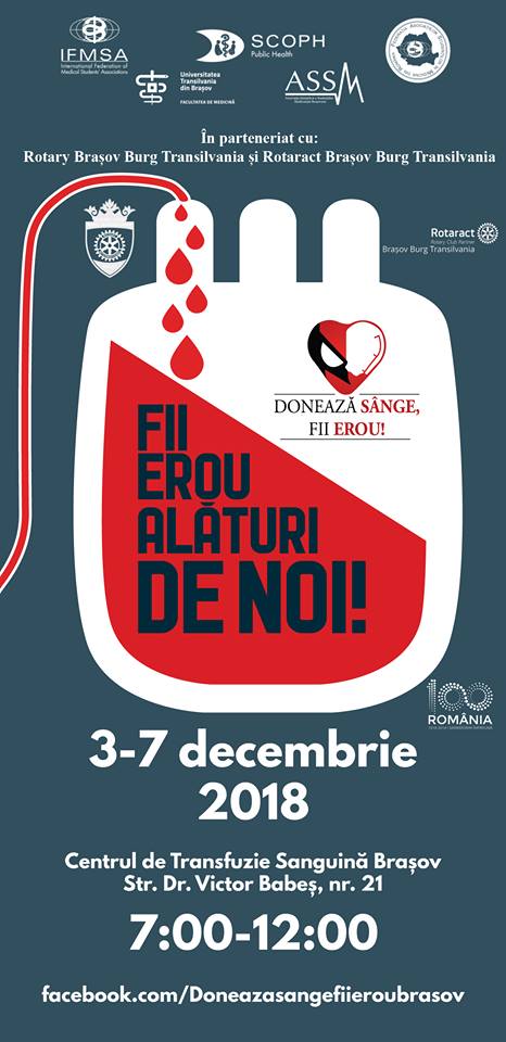 În perioada 3-7 decembrie 2018, brașovenii cu vârste între 18 și 65 de ani, sunt invitați să intre în campania ”Donează sânge, fii erou!”, derulată de Asociația Științifică a Studenților Mediciniști Brașoveni (ASSM), în parteneriat cu Rotary Club Brașov Burg Transilvania și Rotaract Club Brașov Burg Transilvania.