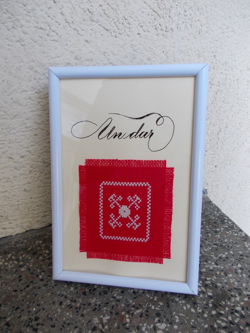 Un tablou 15 x 10 cm realizat, cu broderie manuală și scris de mână, de Motive tradiționale din Țara Bârsei și împrejurimi și Scriptoria – #FăcutManualLaBrașov