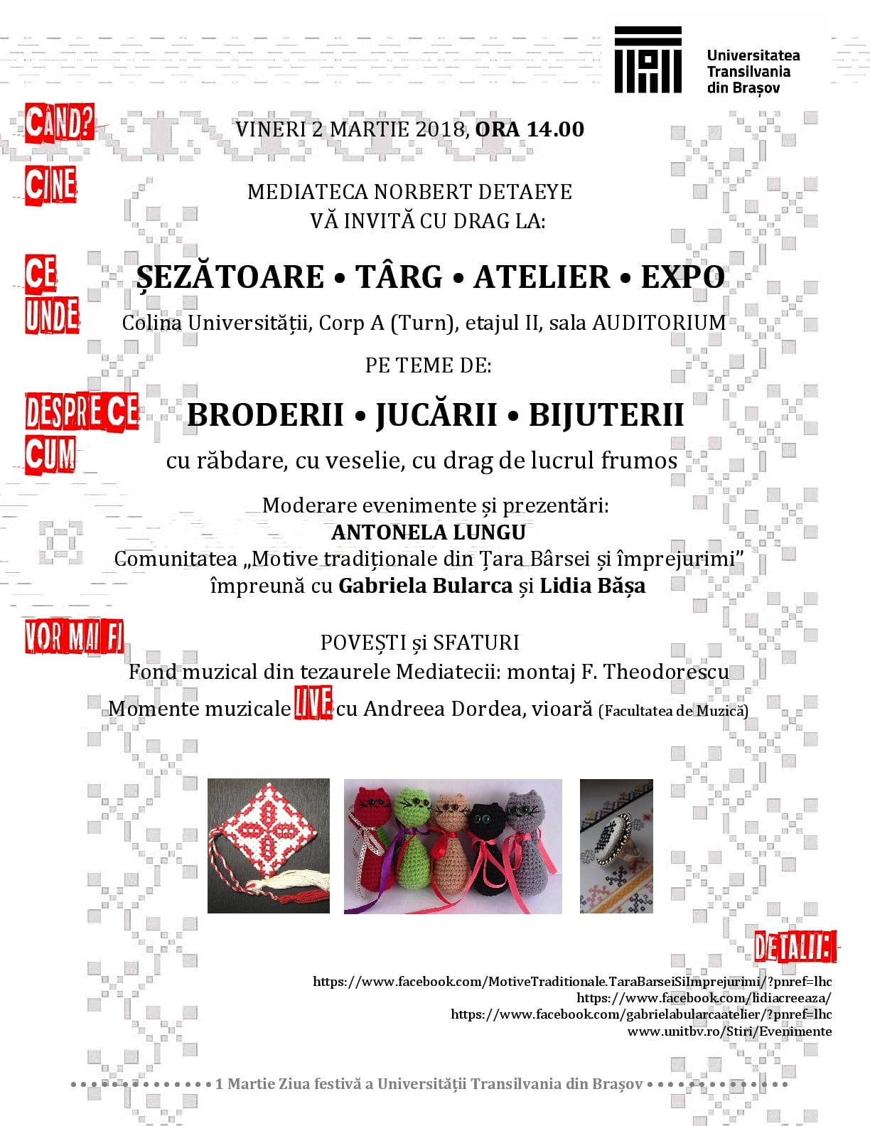 – Șezătoare, târg, atelier, expo, pe teme de broderii, jucării, bijuterii – vineri, 2 martie, ora 14, Colina Universității, Corpul A, sala Auditorium.