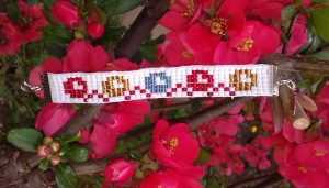 Modelul brațării este stilizat floral, preluat după un model prezent pe iile noastre, trandafirul. Mărgelele de nisip au dimensiunea de 3 mm, mărimea medie. Și pentru că suntem într-un an cu mare însemnătate istorică pentru noi că popor, ne vom raporta la culorile tricolorului.
