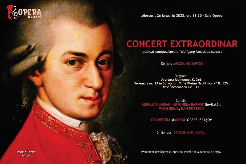 Miercuri, 26 ianuarie 2022, de la ora 18.30, în Sala Operei Brașov, vă invităm la un Concert extraordinar dedicat lui W.A. Mozart (27 ianuarie 1756 – 5 decembrie 1791). Astfel, inaugurăm o serie de evenimente care stau sub semnul genialității acestui compozitor și care vor continua pe 29 ianuarie 2022 cu „Mozart per sempre”, un concert ce cuprinde momente muzicale din operele scrise de Mozart, toate celebre, 12 februarie 2022 – „Nunta lui Figaro” și 26 februarie 2022 – „Flautul fermecat”. În programul Concertului extraordinar din 26 ianuarie 2022 sunt incluse: Uvertura operei „Idomeneo” K. 366, Serenada nr. 13 în Sol Major „Eine Kleine Nachtmusik” K. 525 și Misa Încoronării KV. 317, concert vocal-simfonic. Soliști vor fi: Aurelia Florian – soprană, Antonela Barnat (invitată) – mezzosoprană, Mihai Irimia – tenor, Dan Popescu – bas. Își dau concursul Corul și Orchestra Operei Brașov. La pupitrul dirijoral se va afla maestrul Mircea Holiartoc. Dirijor cor: Dragoș-Mihai Cohal.