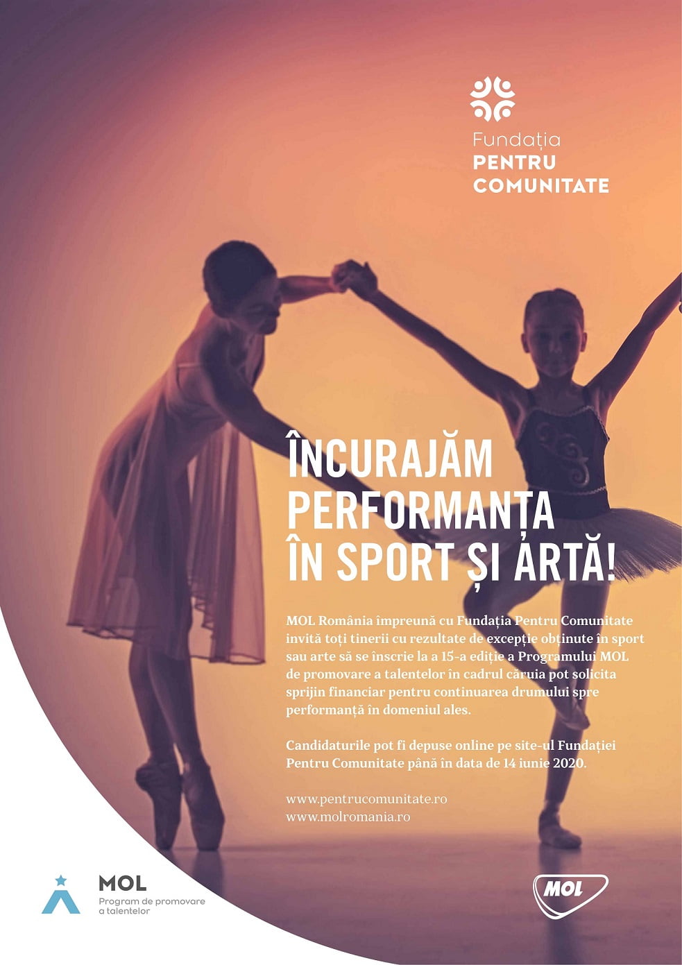 MOL România și Fundația Pentru Comunitate au lansat cea de-a 15-a ediție a Programului MOL de promovare a talentelor. Programul este organizat pe bază de concurs de proiecte și oferă sprijin financiar în valoare totală de 560.000 de lei pentru continuarea activității și susținerea performanței tinerilor sportivi și artiști cu rezultate foarte bune.