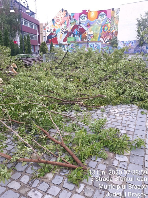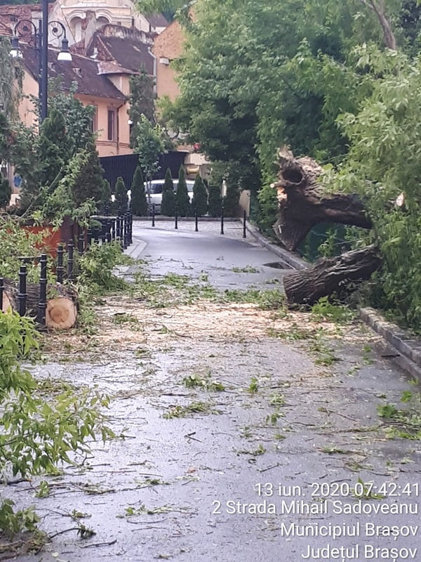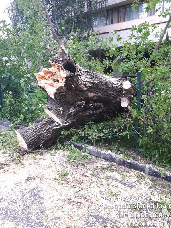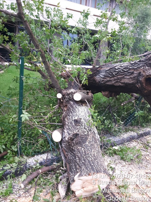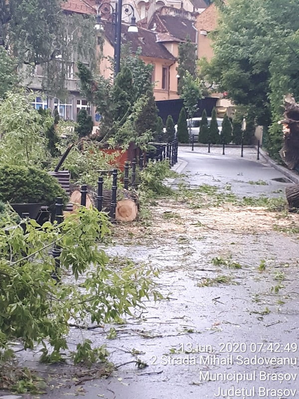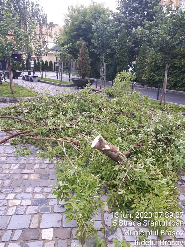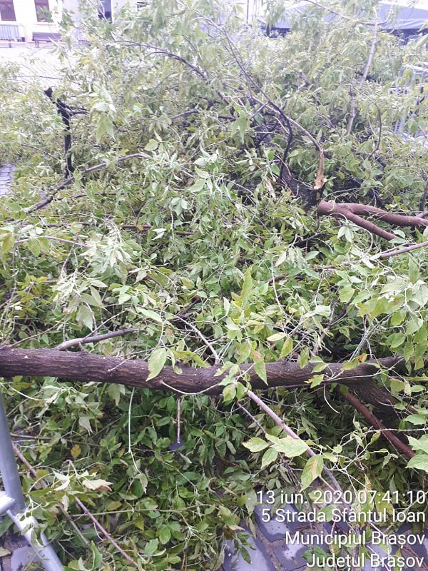 Reamintim că în ultima perioadă au avut loc mai multe incidente cauzate de prăbușirea unor arbori sau crengi în timpul furtunilor. În urmă cu aproximativ două săptămâni, un autoturism a fost avariat în trafic de un corcoduș care s-a prăbușit pe stradă, în zona magazinului Universal. În urmă cu o săptămână, pe strada Sfântul Ioan (în spatele hotelului Aro Palace), un frasin a fost rupt de vântul puternic. Din fericire, pagubele au fost doar de ordin material, fiind deteriorate câteva bănci și jardiniere. La sfârșitul lunii februarie, vântul a rupt mai mulți copaci sau crengi. Pe Strada de mijloc, un tei rupt de la jumătate a avariat semnificativ un autovehicul parcat în zonă.