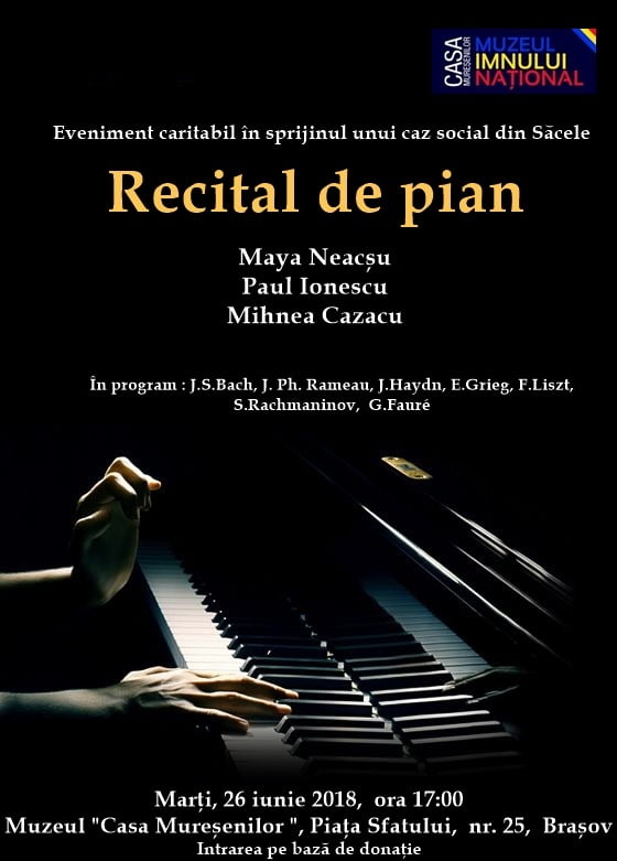 Muzeul „Casa Mureșenilor” din Brașov organizează în data de 26 iunie 2018, ora 17:00 un recital caritabil susținut de trei tineri pianiști brașoveni.
