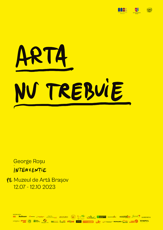 Intervenția „Arta nu trebuie”, semnată de George Roșu, va fi integrată miercuri, pe 12 iulie, pe noua fațadă a Muzeului, luând forma unor panouri cu lucrări ale artistului pe tema necesității artei și a rolurilor pe care aceasta le poate îndeplini în societate. Lucrarea reunește, așa cum declară artistul: „Câteva definiții ale artei care evident nu sunt negociabile, pentru că dacă scrie aia e”.