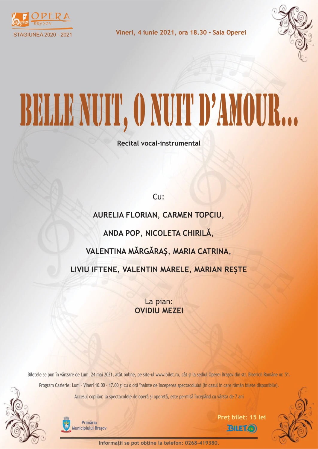 Vineri, 4 iunie 2021, de la ora 18.30, la Opera Brașov, vă așteptăm la Recitalul vocal-instrumental extraordinar „Belle nuit, o nuit d’amour…”, susținut de artiștii Operei Brașov: Aurelia Florian – soprană, Carmen Topciu – mezzosoprană, Anda Pop – soprană, Nicoleta Chirilă – soprană, Valentina Mărgăraș – soprană, Maria Catrina – soprană, Liviu Iftene – tenor, Valentin Marele – bariton, Marian Rește – bariton, acompaniați la pian de Ovidiu Mezei.