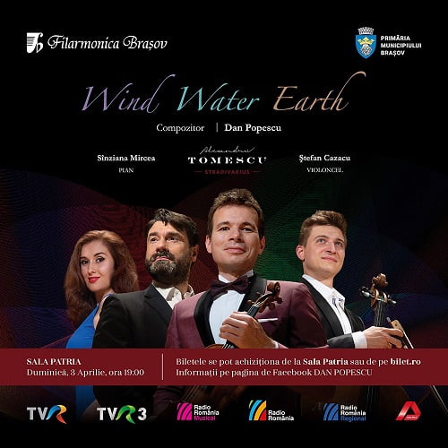 Duminică seară, de la ora 19, violonistul Alexandru Tomescu, care va cânta pe o vioară Stradivarius, violoncelistul Ștefan Cazacu și pianista Sînziana Mircea, împreună cu compozitorul Dan Popescu, vor lansa CD-ul Wind Water Earth printr-un recital de excepție.