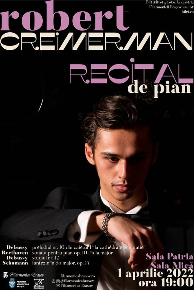 Weekendul începe vineri la ora 19 cu un recital al tânărului pianist Robert Creimerman, care va cânta piese de Claude Debussy, Ludwig van Beethoven și Robert Schumann.