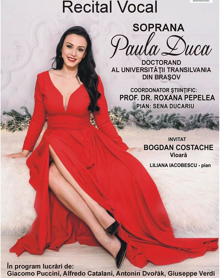 Duminică, 8 decembrie 2019, ora 15.00, Paula Duca va susține un recital vocal la Sala Patria, avându-i ca invitați pe renumitul violonist, tânărul Bogdan Costache și cunoscuta pianistă Liliana Iacobescu.