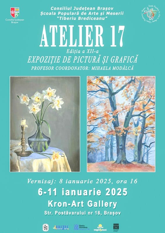 Vernisajul expoziției „Atelier 17” s-a desfășurat miercuri, 8 ianuarie 2025, de la ora 16:00 la Galeria Kron-Art din Strada Postăvarului nr. 18, Brașov. Expoziția a fost deschisă de pictorul și directorul artistic al Galeriei Kron-Art, Gabriel Stan.