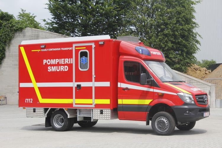 Ambulanța pentru transportul pacienților înalt contagioși este realizată pe un șasiu Mercedes Sprinter, pe care s-a amplasat o suprastructură din panouri sandwich, placate pe interior cu inox, ceea ce permite utilizarea celor mai puternici agenți dezinfectanți. Ambulanța este dotată atât cu un puternic sistem de filtre HEPA, cât și cu un dispozitiv care produce în interiorul ambulanței presiune negativă, împiedicându-se astfel eliberarea agentului patogen în exterior.