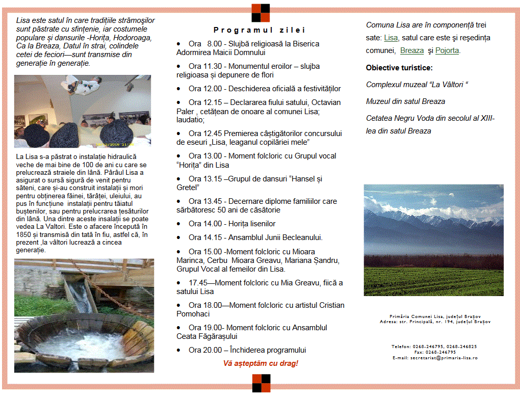 Primăria Comunei Lisa organizează „Ziua comunei” în data de 9 iulie 2017, cu ocazia împlinirii a 490 de ani de atestare documentară.