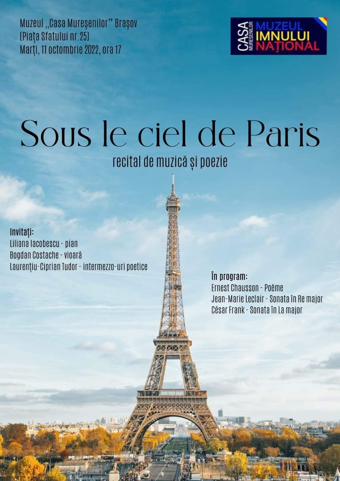 Muzeul „Casa Mureșenilor” Brașov vă invită marți, 11 octombrie 2022, ora 17.00, la recitalul de muzică și poezie „Sous le ciel de Paris”, susținut de Bogdan-Alexandru Costache – vioară, Liliana Iacobescu – pian și Laurențiu-Ciprian Tudor – poet.