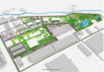 - Scenariul 2: sunt menținute 36% dintre clădirile existente, care vor fi renovate, reconsolidate și folosite pentru diferite tipuri de funcționalități. În acest scenariu, se propune dezvoltarea de clădiri noi pe o suprafață de 23.500 mp și reconversia celui mai mare depozit de pe amplasament prin demolarea părții de mijloc și dezvoltarea de blocuri rezidențiale deasupra. Pe o suprafață de 14,2 ha, se amenajează parcuri și spații verzi create pe loturi.