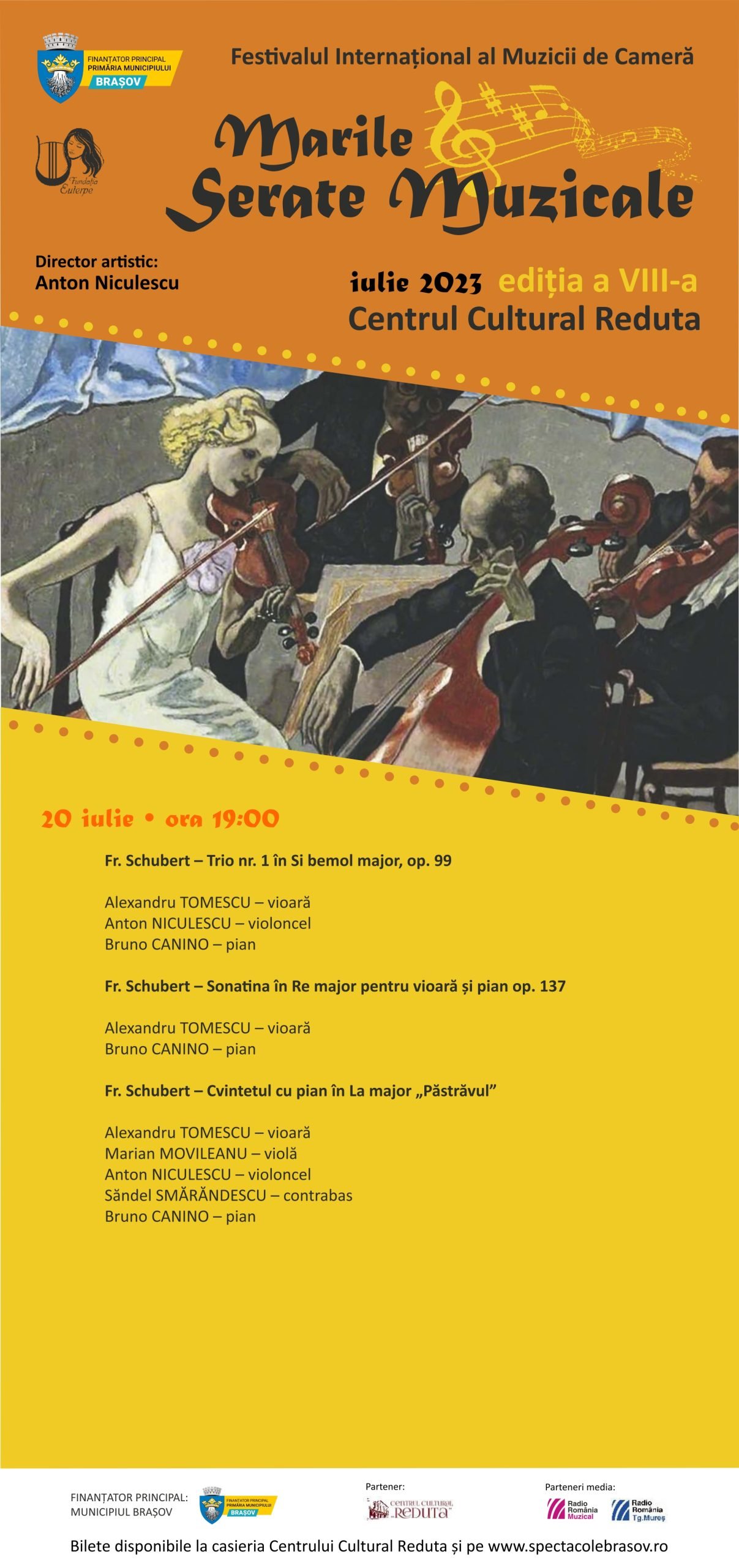 Aflat la cea de-a opta ediţie, Festivalul Internațional de Muzică de Cameră „MARILE SERATE MUZICALE”, proiect cultural finanțat de Consiliul Local și Municipiul Brașov, se va desfăşura în zilele de 18, 19 și 20 iulie 2023 la Centrul Cultural „Reduta” din Braşov și aduce publicului românesc, în particular, braşovean, grandoarea şi valorile universale ale muzicii clasice de cameră. Este un festival de înalt nivel şi prestigiu, care pune împreună muzicieni consacraţi, solişti de nivel european şi mondial.