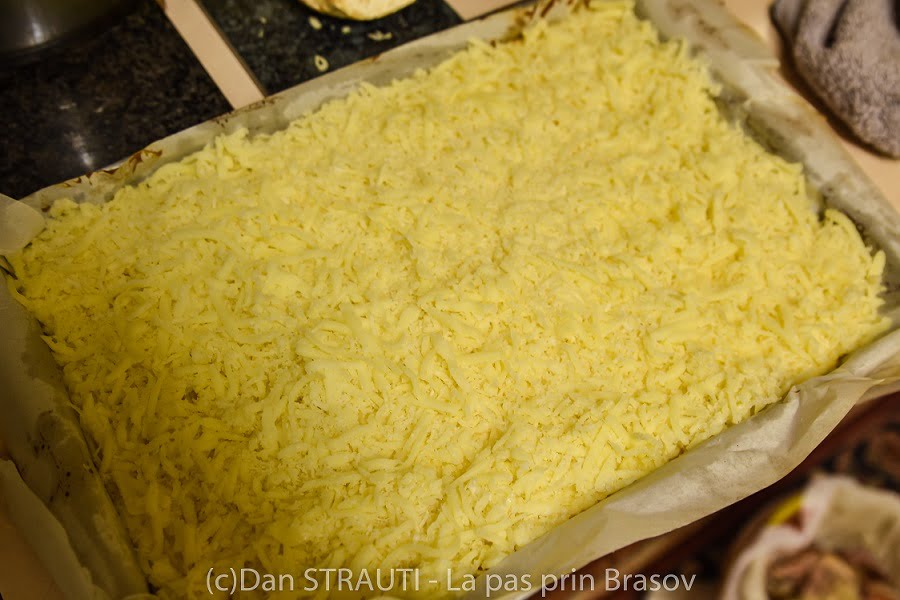 Dacă aveți dexteritate, experiență și îndemânare, după ce scoateți tava din cuptor, turnați uniform cașcavalul și untul în bucățele mici peste aluat și rulați hârtia cu aluatul.