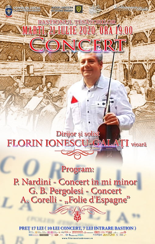 Marți, 21 iulie 2020, ora 19.00, Orchestra Simfonică a Filarmonicii Brașov, sub îndrumarea artistică a solistului invitat, Florin Ionescu – Galați, vă invită să ascultați muzica italiană, în repertoriu aflându-se lucrări ale unor recunoscuți compozitori italieni: P. Nardini – Concert în mi minor, G. B. Pergolesi – Concert și A.Corelli – „Folie d’Espagne”.