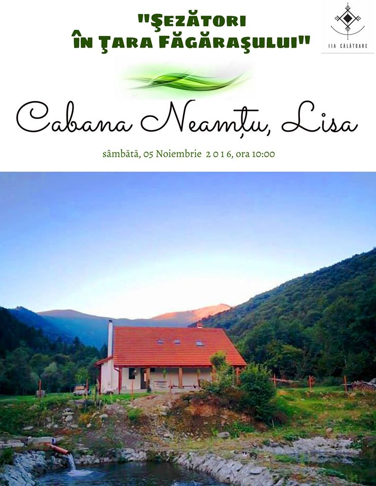 „Cea de-a treia şezătoare din cadrul proiectului itinerant „Şezători în Ţara Făgăraşului” ne va aduce şi mai aproape de munţi de data aceasta. Ne întâlnim sâmbătă, 05 Noiembrie 2016, la Cabana Neamţu din Lisa, judeţul Braşov.