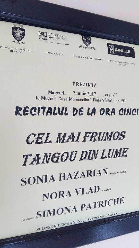 Opera Braşov şi Muzeul „Casa Mureşenilor” Braşov vă invită miercuri, 7 iunie 2017, ora 17.00, la „Recitalul de la ora cinci” – Cel mai frumos tangou din lume.