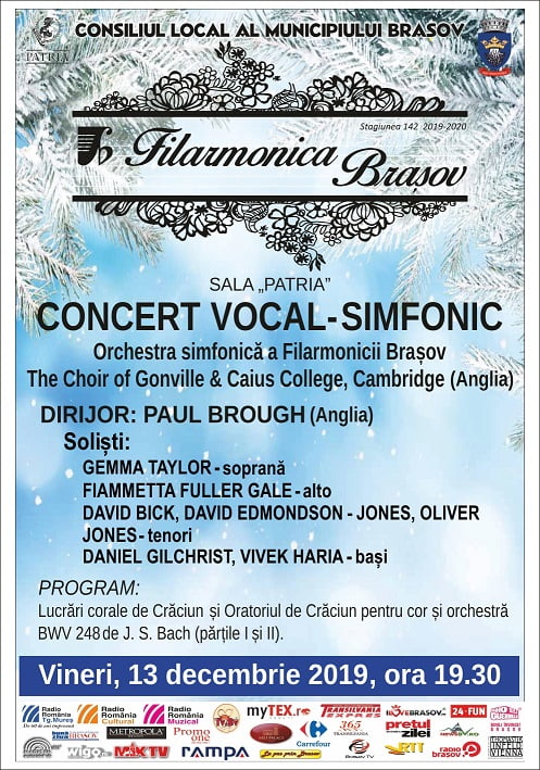 Vineri, 13 decembrie 2019, ora 19.30 la Sala Patria va avea loc Concertul Vocal Simfonic susținut de Orchestra Simfonică a Filarmonicii Brașov și Corul Colegiului Gonville and Caius, unul dintre cele mai vechi colegii din Universitatea Cambridge.