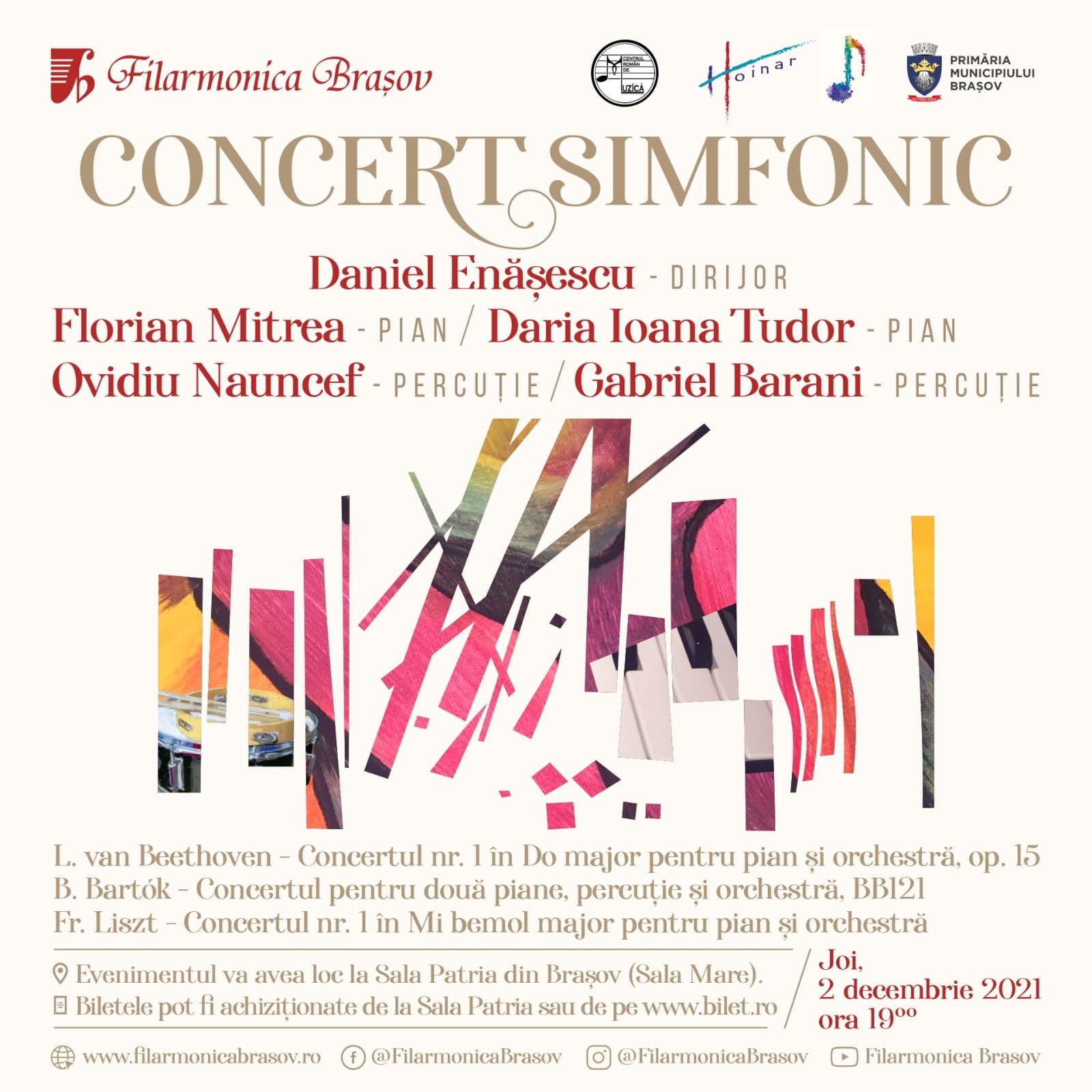 Joi seară, pe 2 decembrie, de la ora 19.00, pe scena Sălii Patria a Filarmonicii din Brașov vor urca doi dintre cei mai talentați pianiști de origine română aclamați internațional pentru a deschide ediția 2021 a Festivalului Hoinar. Daria Ioana Tudor – lector la celebra Universität der Künste din Berlin, cu o carieră internațională pe scenele din Germania, Austria sau Statele Unite ale Americii – și Florian Mitrea, profesor la renumita Academie Regală din Londra, aclamat pe scena legendarei Carnegie Hall din New York aduc publicului un maraton cu trei concerte pentru pian de Beethoven, Bartok și Liszt în aceeași seară, pe aceeași scenă! Sub bagheta dirijorului Daniel Enășescu și alături de Orchestra Simfonică a Filarmonicii din Brașov, muzica propune o călătorie „La porțile viitorului”: ascultătorii sunt invitați să treacă de la un concert pentru pian la altul, pornind de la Beethoven, cel care a emancipat pianul ca instrument de anvergură, ajungând la Dublul concert de Bartok, lucrare ce pune în parteneriat pentru prima dată în istorie doi pianiști, doi percuționiști, și o întreagă orchestră simfonică, și terminând cu Concertul în Mi bemol major de Liszt, piesă de avangardă care a revoluționat relația pian-orchestră și care împinge limitele tonalității la extreme, cu intensitate maximă.