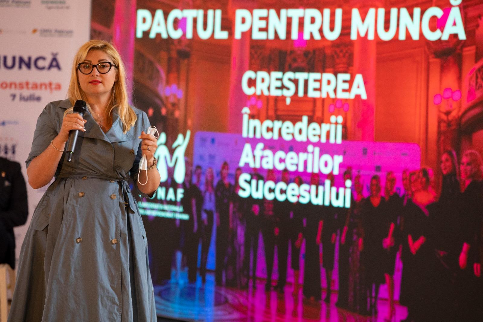 “Vrem să muncim în România! Vrem să învățăm o meserie în România!” a declarat Cristina Chiriac, preşedintele Confederaţiei Naţionale pentru Antreprenoriat Feminin – CONAF. Ea a mai adăugat că este timpul să conștientizăm că cea mai importantă resursă a României o reprezintă oamenii și avem datoria morală să le creăm toate condițiile pentru creșterea calității vieții în România. “Pactul pentru Muncă este un instrument prin care invităm la dialog toți actorii principali, patronate, sindicate, guvern, pentru a stabili și construi cu prioritate, o strategie pe termen mediu si lung în ceea ce privește politica de ocupare a forței de muncă. Se spune des despre mediul antreprenorial, că nu reușește să se coaguleze și să acționeze unitar nici măcar atunci când avem obiective de interes național. Iată că Pactul pentru Muncă este mai mult decât un instrument, este un integrator de forțe, poate chiar fi denumit sugestiv Partidul Antreprenorilor”, a declarat Cristina Chiriac, președintele CONAF.